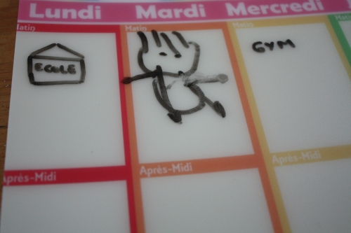 Chaque week-end, j’explique à ma fille le programme de la semaine qui s’annonce et soit j’écris (même si elle ne sait pas lire !) ou bien, elle ou moi dessinons les activités et sorties de chaque jour. Aussi bien à l’école (gym, bibliothèque, chorale, NAP) qu’en famille.