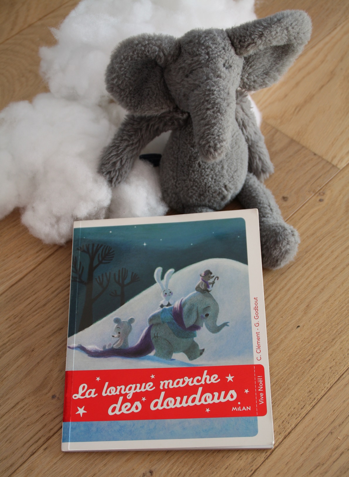 Décembre ! Désormais les préparatifs de Noël peuvent débuter et on peut ressortir les histoires de Noël, comme ce livre que ma fille a eu en cadeau l’an dernier : La marche des doudous de Claire Clément et Geneviève Godbout aux éditions Milan.