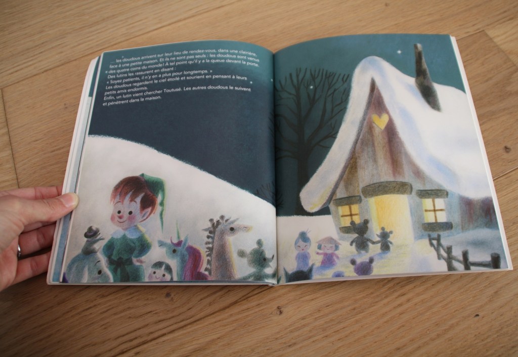 Avez-vous déjà remarqué que les doudous disparaissaient durant la nuit de la veille de Noël ? Non ? Surtout n’essayez pas de les retenir. Ils ont une mission très importante. Vous voulez savoir quoi ? Est-ce que vous avez été sages ? Oui. Bon, d’accord, je vais vous mettre dans la confidence. Chaque année, avant Noël, les doudous, font une très longue marche pour se rendre chez… Je vous le dis ? Chez le Père Noël. Oui, oui, tous les doudous du monde. Et pourquoi me direz-vous ? Pour dire au Père Noël le plus grand souhait des enfants pour le 25 décembre. Parce qui d’autres que les doudous connaissent aussi bien les enfants, leurs rêves et leurs secrets.