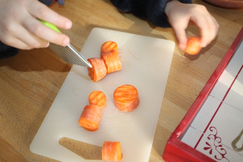 Ma fille a coupé les carottes grâce au coupe légume à lame ondulé (déjà utilisé pour couper des pommes ici).