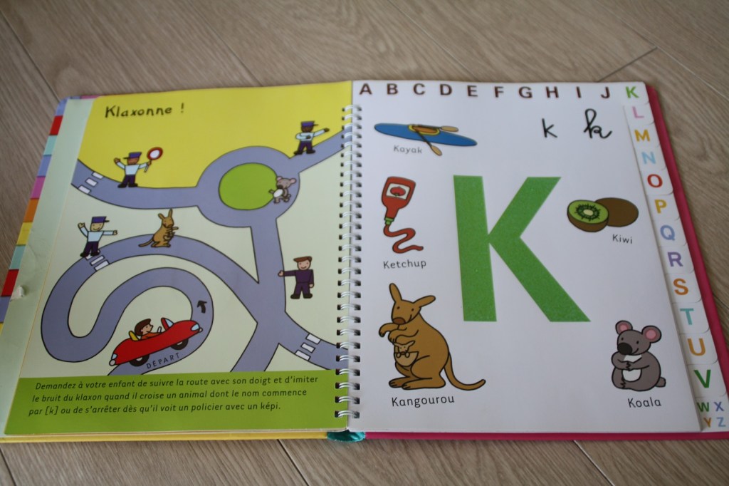 Quand ma fille veut écrire un mot, elle demande qu’on lui dicte les lettres et si elle ne sait pas former une lettre, elle peut regarder dans le livre. Sinon, son jeu préféré est : elle choisit une lettre et on doit trouver tous les objets ou animaux présentés sur la page.