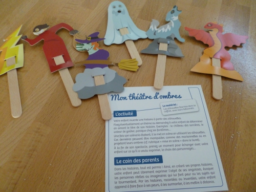 Nous avons donc testé le théâtre d’ombres pour jouer avec les personnages ou phénomènes qui font peur. Les marionnettes sont incluses (pour certaines activités, il faut du matériel non fourni) : le loup, le fantôme, la sorcière, le cambrioleur, l’orage et le monstre. L’occasion de lui dire que la plupart est imaginaire et n’existe pas.