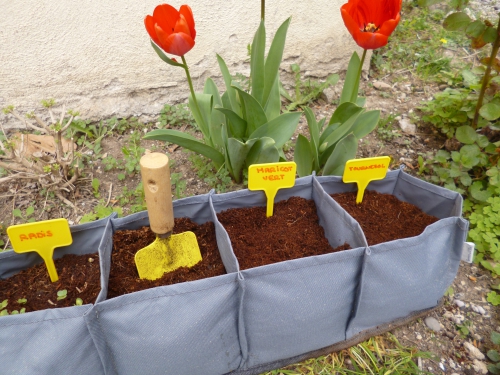 Puis, début avril, nous avons semé les graines de haricot vert nain et de tournesol nain. Il nous restera à planter les carottes rondes dès le mois de mai.