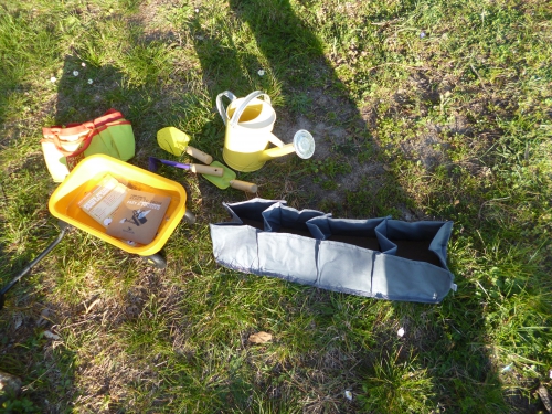 Nous avons donc sorti tout le matériel nécessaire (son petit matériel à elle) : outils de jardinage, chariot, tablier, gants et arrosoir.