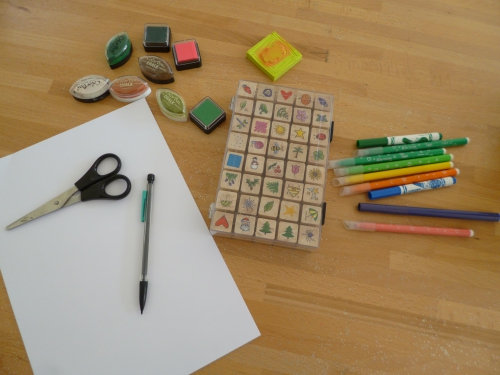 Etape 2 : la réalisation des planches. Elle a créé trois planches avec les tampons (et les encres que l’on avait, dû ces couleurs parfois surprenantes) et les feutres.
