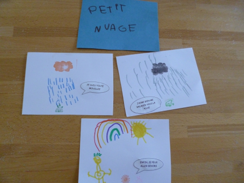 Etape 1 : l’histoire. J’ai demandé à ma fille d’imaginer l’histoire d’un petit nuage qui arrive dans un ciel bleu et va tout arroser. Son résumé : le nuage arrose les plantes, après c’est l’orage et ensuite il y a un arc en ciel. Je l’ai stoppée là sinon l’histoire aurait continué avec la neige, un bonhomme de neige…