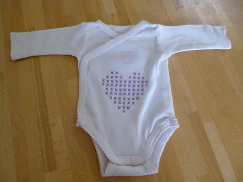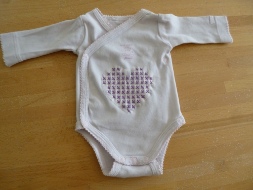J’ai d’abord bien repassé le support, soit le petit body. J’ai découpé un motif coeur au point de croix. J’ai collé ce morceau de feuille magique sur le body. J’ai choisi de le coller sur l’avant du body croisé afin que les noeuds ne soient pas en contact avec la peau fragile du bébé. Le motif peut être repositionnable, mais comme je n’ai pas testé, je ne peux pas vous le confirmer.