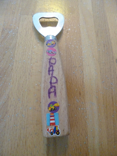Cette année, qui dit Euro 2016, dit b… (à consommer avec modération), d’où l’idée de décorer un décapsuleur en bois. Ma fille y a collé les gommettes de son choix sur les deux côtés, écrit papa au feutre et j’ai verni la partie en bois