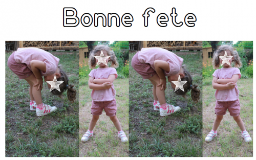 Pour la quatrième fête des pères, en mode pom pom girl, elle avait dessiné les lettres P A P A avec le corps (allez, dites-moi que vous reconnaissez les lettres, ça me ferait plaisir) et j’avais imprimé l’ensemble des photos.