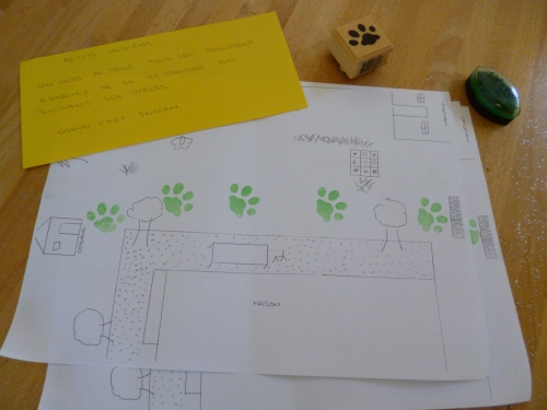 J’ai fait trois photocopies et j’ai représenté le trajet de l’ours (en trois étapes, donc) avec un tampon pattes d’ours. J’ai ensuite donné la première enveloppe avec le message du chef indien et le premier plan aux enfants (en leur montrant un grand saladier vide où l’ours avait dérobé les bonbons), puis j’ai caché des enveloppes avec les deux autres plans.