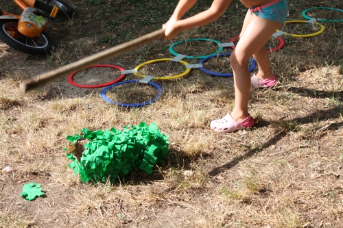 La pinata a été accroché sur un arbre et les enfants ont essayé de la casser à tour de rôle avec un baton. Une sacrée ambiance : des encouragements et des rires quand le baton était agité dans le vide sans la toucher. Bon, mais j’avais du mettre trop épaisseurs de papier mâché. Alors, mon chéri s’y est mis, l’attache a laché et la pinata a été achevée au sol pour enfin libérer les surprises.