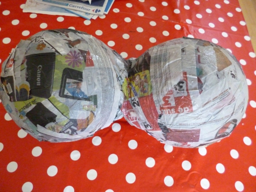 Pour la base, j’ai utilisé deux ballons que j’ai ensuite couvert de papier (publicitaire) collé avec de la colle à base de farine (la recette est ici).