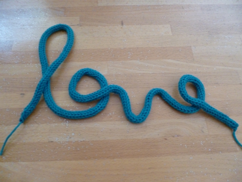 J’ai ensuite préparé 3 cordons de tricotin : un pour le prénom (qui reste une surprise !) et deux de 30 cm pour les poignées.