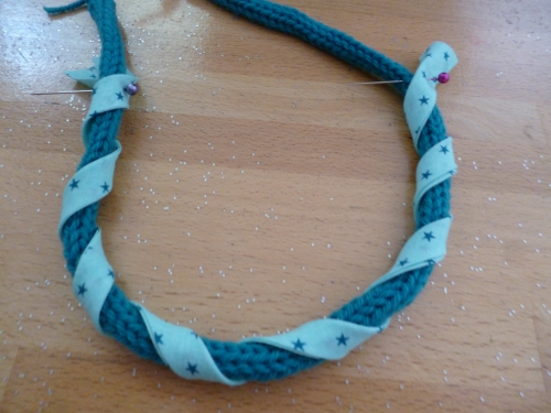 J’ai ensuite torsadé les cordons de tricotin avec le ruban et cousu le tout sur le sac avec le fil à broder.