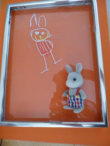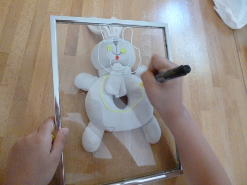 Ma fille a choisi un doudou qu’elle a positionné sous le verre, et l’a dessiné.