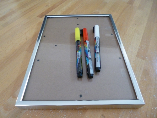 J’ai utilisé un cadre photo en enlevant le fond et en scotchant le verre au cadre. Et quelques marqueurs craies (effaçables à l’eau).