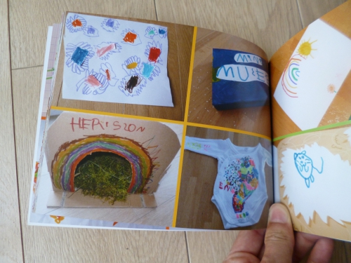Ici, notre solution est de photographier chacune de ces oeuvres pour en garder un souvenir dans un livre photo. J’en avais déjà fait un pour ses premiers dessins. J’ai réalisé récemment celui de son année de moyenne section avec toutes ses réalisations faites à l’école, aux NAP, à la maison ou chez ses grands-parents. Comme il y en avait vraiment beaucoup, j’ai choisi de mettre 4 photos par page (à part pour les très grandes peintures). Mais je suis tout de même arrivée à un livre de 56 pages !