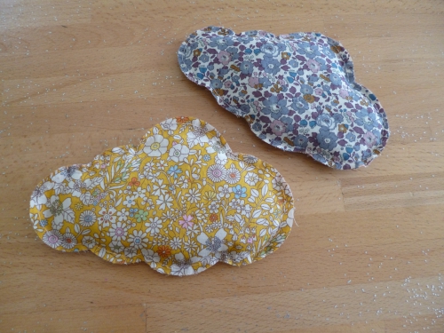 J’ai cousu trois nuages, une étoile et une lune dans du tissu liberty, uni ou à motif. Ils sont rembourrés avec un peu de molleton. Puis, j’ai créé le support pour le mobile, soit un rond en tissu molletonné sur lequel j’ai ajouté des étoiles en flex doré.