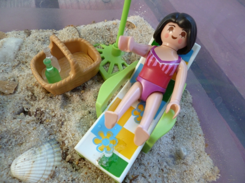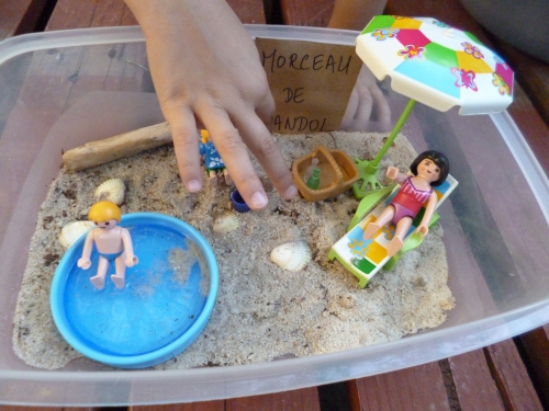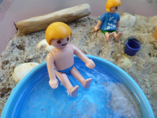 1. On a fait un peu les mêmes choses cet été. On avait aussi attrapé quelques bernard l’hermitte pour les observer et j’ai aussi fait des bacs sensoriels lorsque nous étions à la maison pour que les enfants jouent à l’ombre avant de pouvoir aller dans leur mini piscine ou au lac. Mes 2 petits ont adoré emmené les playmobils dans leur petit lac (bon eux ils avaient des cailloux pour la plage comme au bord du lac), ils ont bien joué avec.