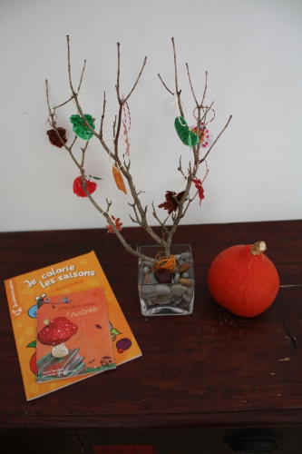 Nous avons repris l’idée pour faire une décoration d’automne. J’ai gardé le vase et ses galets, ainsi que la branche. Ensuite, nous (Grande Soeur, papa et maman) avons utilisé des pochoirs sur le thème de l’automne pour dessiner, puis découper des formes typiques de cette saison : citrouille, feuille, pomme et noisette. Ma fille (l’ainée, mais est-ce bien nécessaire de le préciser ?) les a coloriées. Un petit trou dans chaque et je les ai fixées à l’arbre avec de la ficelle naturelle ou blanche et rouge.