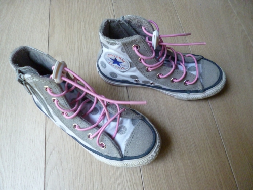 En grande section, elle a moins l’occasion d’enlever ses chaussures, mais comme elle ne sait pas faire les lacets (en fait, je n’ai même jamais essayé de lui apprendre pour le moment, devrais-je ?), il lui faut encore des chaussures faciles à enfiler. Mais comme, je trouve de moins en moins de chaussures à scratch à sa pointure (et qui nous plaisent), j’ai dû faire des adaptations toutes simples : remplacer les lacets par les élastiques.