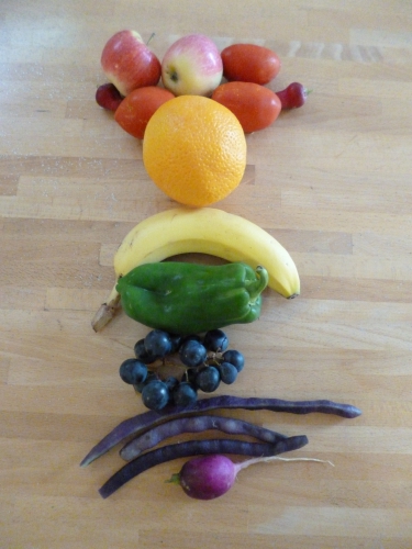 La solution de repli : utiliser les fruits et légumes. Alors pour notre participation au rendez-vous L’art est un jeu d’enfant sur le thème « réinvente ton arc-en-ciel », voici un arc-en-ciel vitaminé.