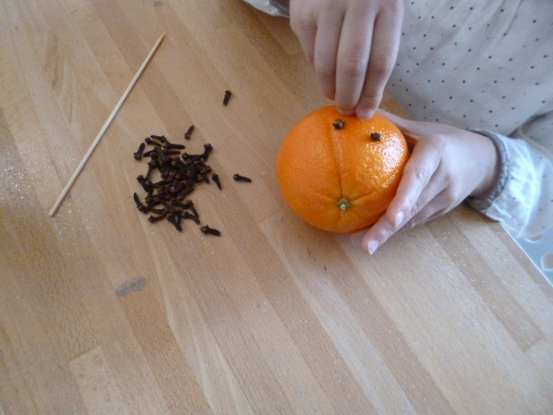 Nous continuons notre décoration de Noël. Comme l’an dernier, nous avons réalisé une pomme d’ambre. C’est une orange plantée de clou de girofle. Cette année, c’est ma grande fille qui l’a fait toute seule. Elle s’est aidée d’un pic à brochette pour percer la peau épaisse de l’orange.