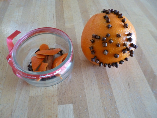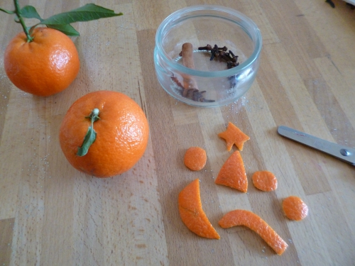 Et pendant ce temps, j’ai fait un pot-pourri avec un bâton de cannelle, des clous de girofle et la peau d’une clémentine, dans laquelle j’ai tenté de découper des formes.