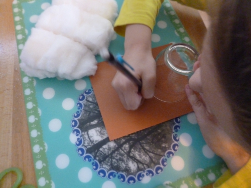 Pour réaliser le deuxième bonhomme, nous avons utilisé du coton et des perles (noires, oranges et grises). Ma fille a dessiné deux cercles à l’aide de deux verres de diamètre différente. Elle y a collé du coton, puis quelques perles pour faire le visage du bonhomme ainsi que les boutons sur son ventre.