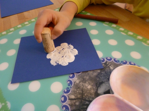 Le quatrième bonhomme a été peint avec l’aide de bouchons de liège, puis son visage, son chapeau et ses bras ont été dessinés au feutre.