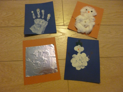 Les flocons tombés la semaine dernière n’ont pas été suffisamment en nombre pour pouvoir faire un bonhomme de neige. Alors comme nous n’avons pas pu faire un vrai bonhomme de neige, nous en avons fait sept sur papier 🙂