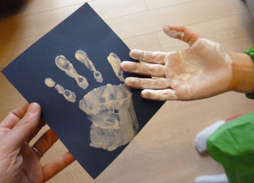 Le premier (enfin les quatre premiers bonhommes) sont ses empreintes de doigts réalisés à la peinture. Ensuite, elle a ajouté au feutre les détails des têtes.