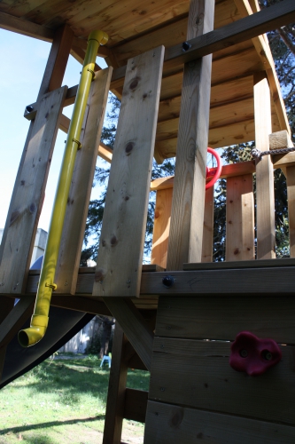 Autant j’ai des idées qui me prennent un temps fou à aboutir. Autant un jeudi, j’ai eu l’idée d’ajouter un système de téléphonie sur notre portique, le vendredi j’ai fait un saut au magasin de bricolage et le samedi c’était installé. La plateforme du portique donnant sur le toboggan n’étant accessible que via une pente d’escalade avec corde ou un mur d’escalade, j’ai pensé que bébé n’y grimperait pas de sitôt. D’où l’idée de créer un moyen de communication entre la grande et la petite.