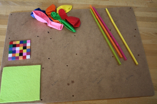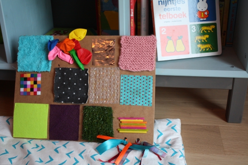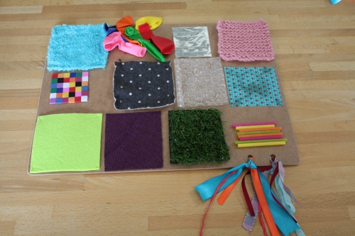Lors de mon tour au rayon plomberie du magasin de bricolage (mon bricolage pour le portique est là), j’avais aussi acheté un morceau de médium. L’idée : en faire un tableau sensoriel pour bébé avec plein de textures différentes.