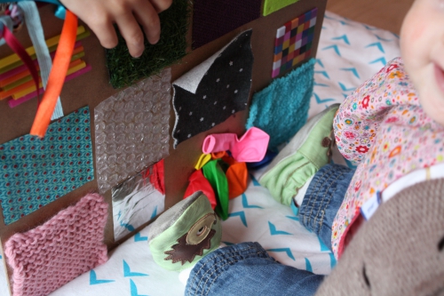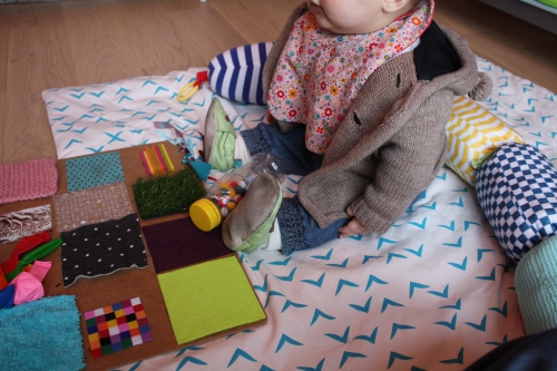 Bébé aime beaucoup les livres à toucher, du genre avec des dessins d’animaux avec fausse fourrure. Et dès que l’on ouvre un livre, ses petites mains touchent les pages à la recherche de textures autre que le papier de la page. Du coup, j’ai voulu lui créer un jeu pour découvrir le doux, le rugueux, le granuleux, le fibreux, le lisse…