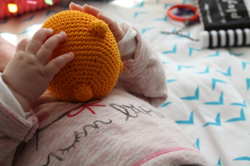 En ce moment, elle joue assez avec sa balle de préhension. Avec sa structure, elle est facile à prendre en main, plus que son autre balle en crochet. Elle aime bien que l’on fasse rouler l’une ou l’autre des balles sur son ventre.