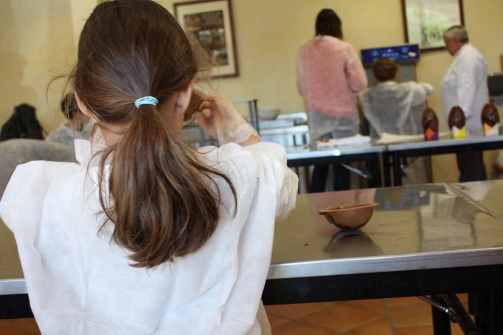 Après avoir enfilé une blouse blanche, nous avons été accueilli par un artisan chocolatier. Enfin une ; ça se dit : une artisane chocolatière ? Elle nous a expliqué que les enfants allaient réaliser tout seul leur oeuf, même si nous pouvions les aider. Du coup, je n’ai pas mis de gants et j’ai bien fait… car malheureusement je me suis mis du chocolat sur les mains et j’ai dû me lécher les doigts (note pour plus tard : être plus maladroite ;).
