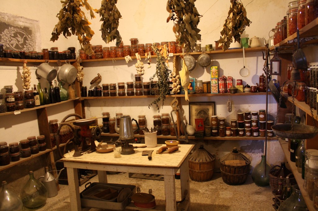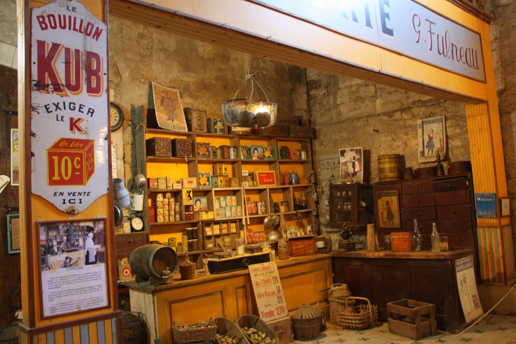 Puis il y a ces grands bâtiments. Dans un, nous y avons découvert la maison du fermier, le salon meublé avec un mélange d’éléments de 1900 à 1950, les chambres, le garde-manger avec ses nombreux bocaux ainsi que le coin pour préparer les fromages. Dans un autre espace, étaient reconstitués des boutiques comme une épicerie, un magasin de bricolage ou de jouets. Une des boutiques était meublée et décorée avec les meubles et le stock restant d’un vrai magasin de la région ayant fermé. A l’étage, nous avons découvert une salle de classe, qui n’était pas sans rappeler le musée de l’école d’autrefois que nous avions visité il y a trois ans. Et puis, comme nous étions dans une ferme, il y avait beaucoup d’anciens matériels agricoles avec des photos en noir et blanc pour montrer le travail des agriculteurs.