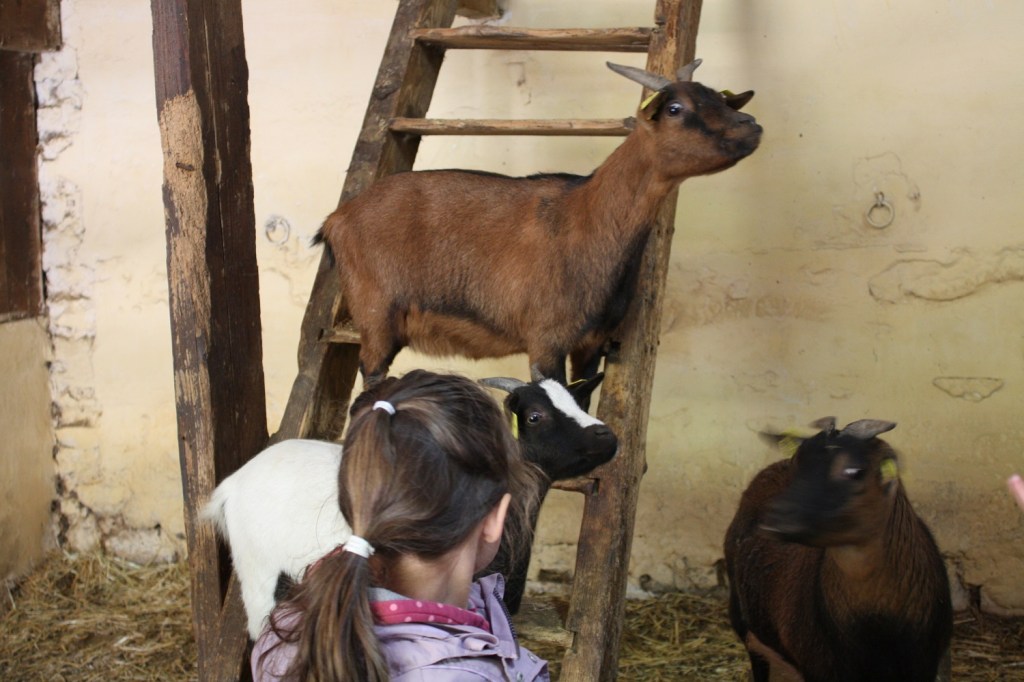 Bien sûr, ce qui plaît le plus aux enfants ce sont les animaux. Et quelle proximité avec eux ! Nous sommes arrivés au moment du biberon des agneaux et chevreaux. Même si la grande n’a pas osé lever la main pour aller nourrir les petits animaux, de nombreux enfants leur ont donné le biberon et nous avons bien rigolé de voir ces petits gloutons et aux blagues du fermier-animateur.