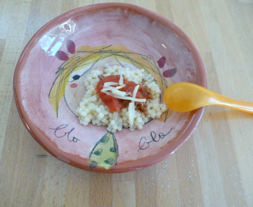 Pour la sauce, je vous propose deux cuissons différentes. Plongez la tomate 10 secondes dans l’eau bouillante pour enlever facilement la peau. Coupez et épépinez la tomate et faites la cuire au Babycook (niveau 2 d’eau). Faites ensuite cuire le boeuf (sous forme haché, en steak haché frais ou surgelé…) au Babycook (niveau 3 d’eau). Mixez le tout. Versez la sauce sur les pâtes, ajoutez l’huile et un peu d’emmental râpé.