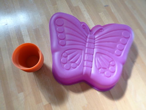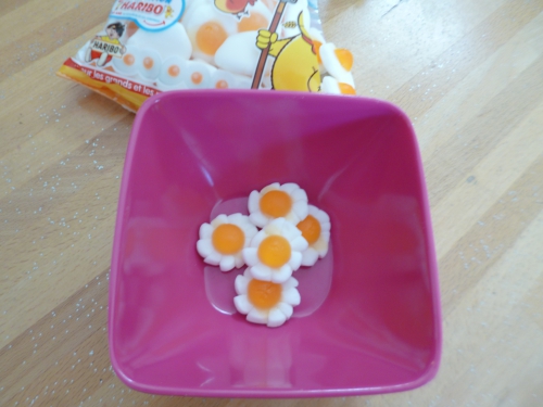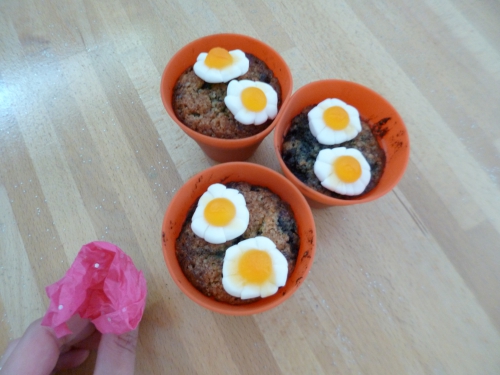 Pour le gâteau, j’avais préparé un gâteau au chocolat tout simple dans un moule papillon. J’avais aussi fait quelques muffins à la myrtille dans des moules en forme de pot. Quelques bonbons oeufs recoupés donnaient l’impression de petites marguerites.