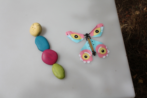 Le gagnant était la reine des abeilles ou le roi des bourbons et devait diriger toute la troupe pour le prochain jeu, qui n’était rien d’autre qu’une mini-chasse au trésor. Il fallait retrouver les galets colorés constituant le corps de la chenille. Cinq minutes plus tard, la chenille était complète, pouvait se transformer en papillon et nous annonçait qui avait mangé les bonbons.