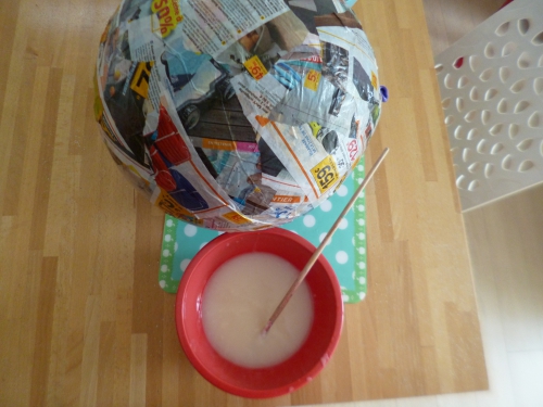 Alors, vous qui avait vu les photos, qui a mangé tellement de bonbons qu’elle est devenue énorme ? La coccinelle, la coccinelle pinata. Réalisée comme l’an dernier avec un ballon et du papier mâché, elle était encore trop dure à casser et le papa a du les aider.