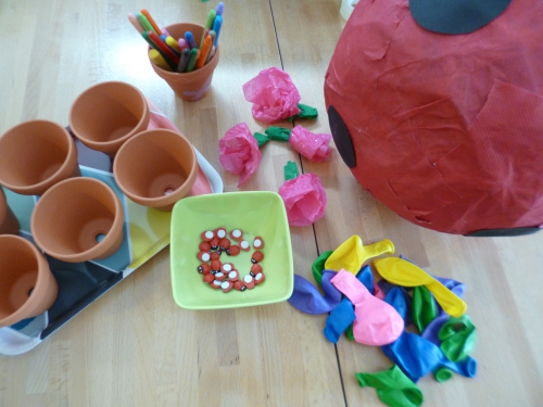 Des bonbons, des sucettes et des ballons à se partager. Et pour y mettre ces sucreries et quelques cadeaux supplémentaires, j’avais prévu des petits pots de fleurs à décorer. Crayons de cire, pochoirs et coccinelles en bois autocollantes sont venus personnalisés les contenants. Et pour le contenu, il y avait des barrettes et élastiques coccinelles, abeilles et fleurs pour les filles ; des billes et une gomme en forme de carotte pour le garçon.