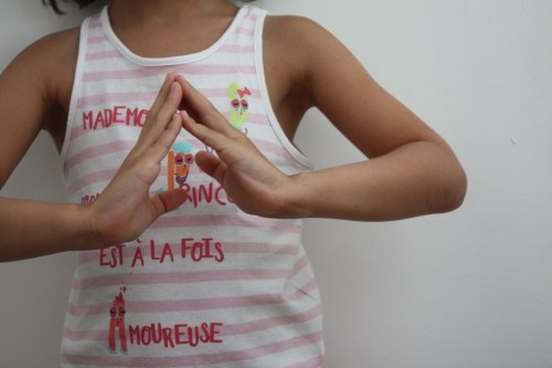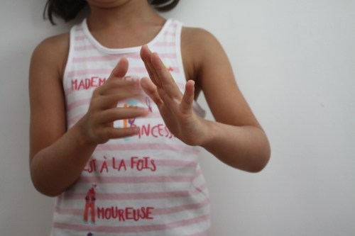 C’est pourquoi, et parce que certains parents l’avaient demandé, la crèche de la cadette a organisé des ateliers de langue des signes pour les parents et les personnes travaillant à la crèche non encore familière avec ce mode de communication. Car finalement, les signes permettaient aux auxiliaires et éducatrices de la crèche de mieux comprendre les enfants. Mais les parents eux, étaient toujours aussi perplexes quant aux demandes de leurs enfants. Et un geste pris pour une extrait de la chanson « la fourmi m’a piqué la main » signifiait en fait « encore ». Vous voyez, lorsque que l’on tape le bout des doigts dans la paume de l’autre main.