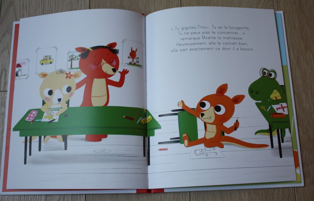 Cette année, elle est au CP et a donc des devoirs à faire presque chaque jour. Un soir qu’elle n’arrivait pas à se concentrer sur l’exercice à faire et qu’elle s’agitait tel un jouet à ressort sur sa chaise, je lui ai proposé de faire une courte pause. Je lui ai lu l’histoire et elle a fait comme Titou. Cela n’a pas duré longtemps, car le temps avant le coucher était compté, mais elle était plus zen pour terminer ensuite ses devoirs. Depuis le livre est resté dans le séjour, à portée de main, et elle sait qu’elle peut faire une pause comme Titou quand elle en a besoin.