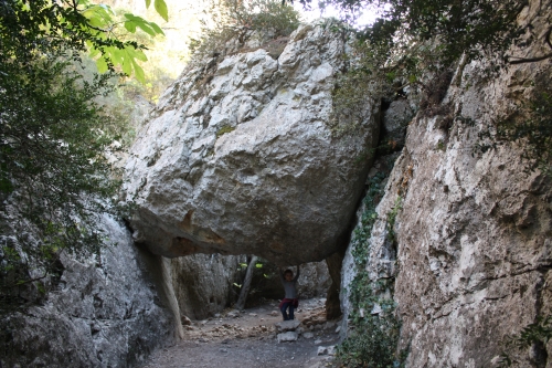 Nous n’avions pas prévu de faire la boucle complète de randonnée en suivant le GR. Nous avons donc fait demi-tour pour traverser les gorges en descente. Pour les passages difficiles : en mode mi descente accroché face à la paroi, mi toboggan sur les rochers rendus lisses par les passages de promeneurs. Au total, la balade aura duré deux heures (avec la pause goûter).