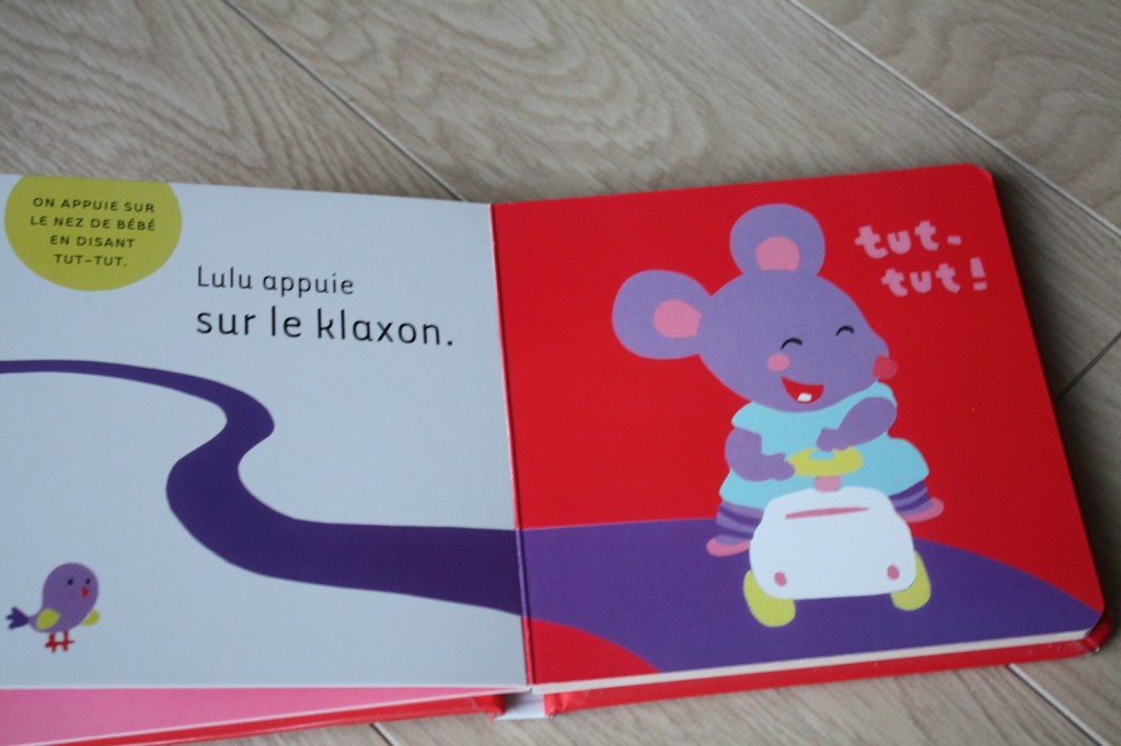L’assoir sur mes genoux, lui raconter une histoire tout en mimant, la cadette (17 mois) adore. Ce week-end, elle n’attendait même pas la dernière page du livre pour signer « encore ». Alors, nous avons lu encore et encore Tut-tut. J’ai tapoté son petit nez en disant tut-tut pour faire le klaxon ; et elle a même fini par le faire elle-même dès que je tournais la page.