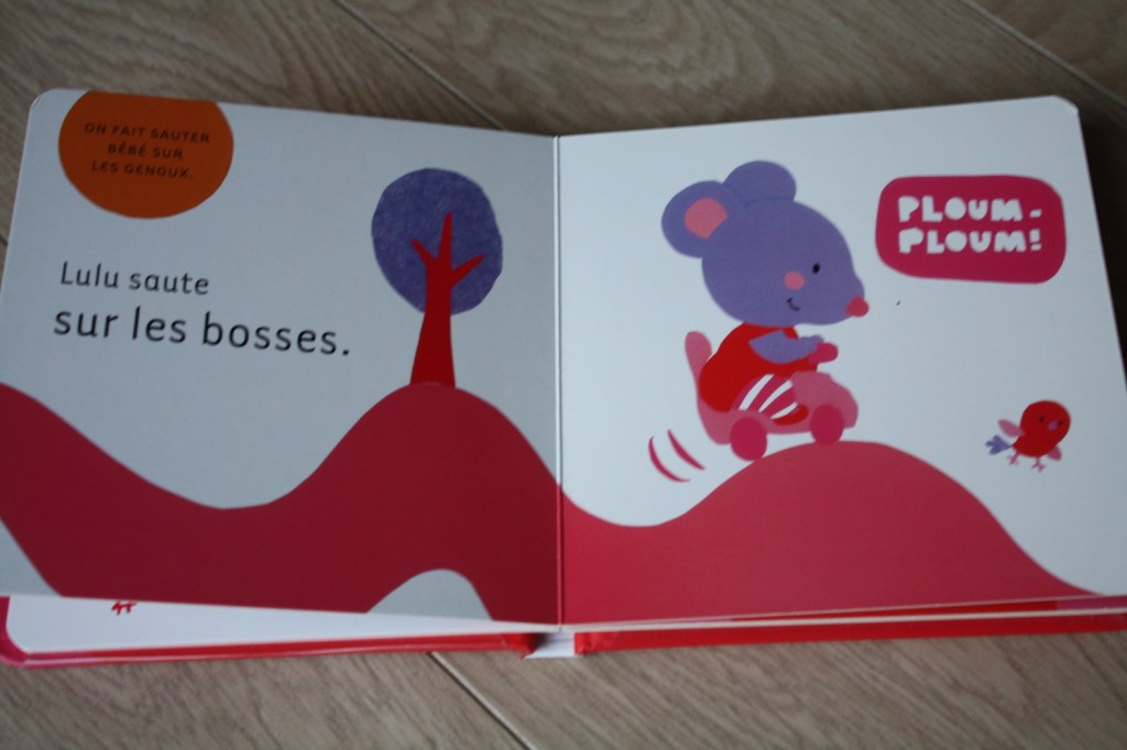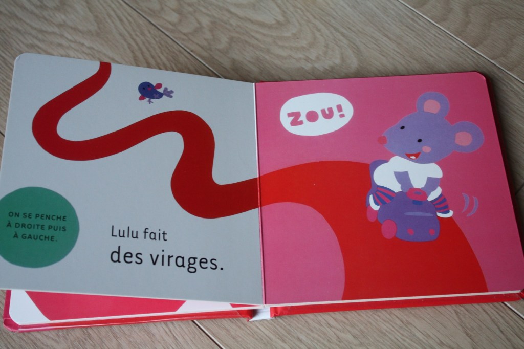 Lulu est une souris qui enfourche son porteur et entraîne bébé sur un chemin bosselé, virage à gauche, puis à droite. Oups, Lulu est allé trop vite, c’est l’accident. Heureusement tout va bien. Des illustrations simples et colorées, des pages cartonnées, des onomatopées à dire pendant que l’on mime font aussi le succès de ce livre.