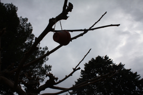 Ma fille a préparé le repas des oiseaux en mélangeant la margarine avec les graines. Puis elle a décoré les petits pots avec des dessins de coccinelles, papillons… J’ai fixé un morceau de corde sur le pot. Elle l’a rempli avec la préparation. Et enfin, nous avons installé les pots sur les arbres dénudés du jardin.